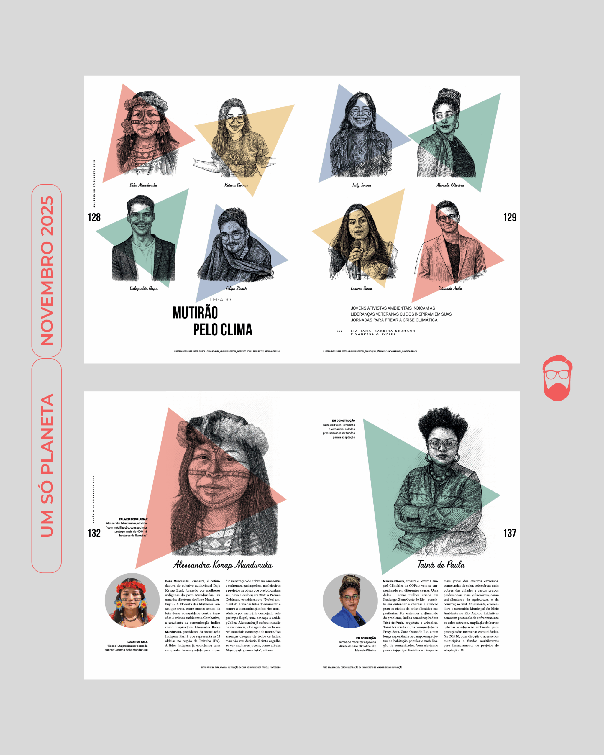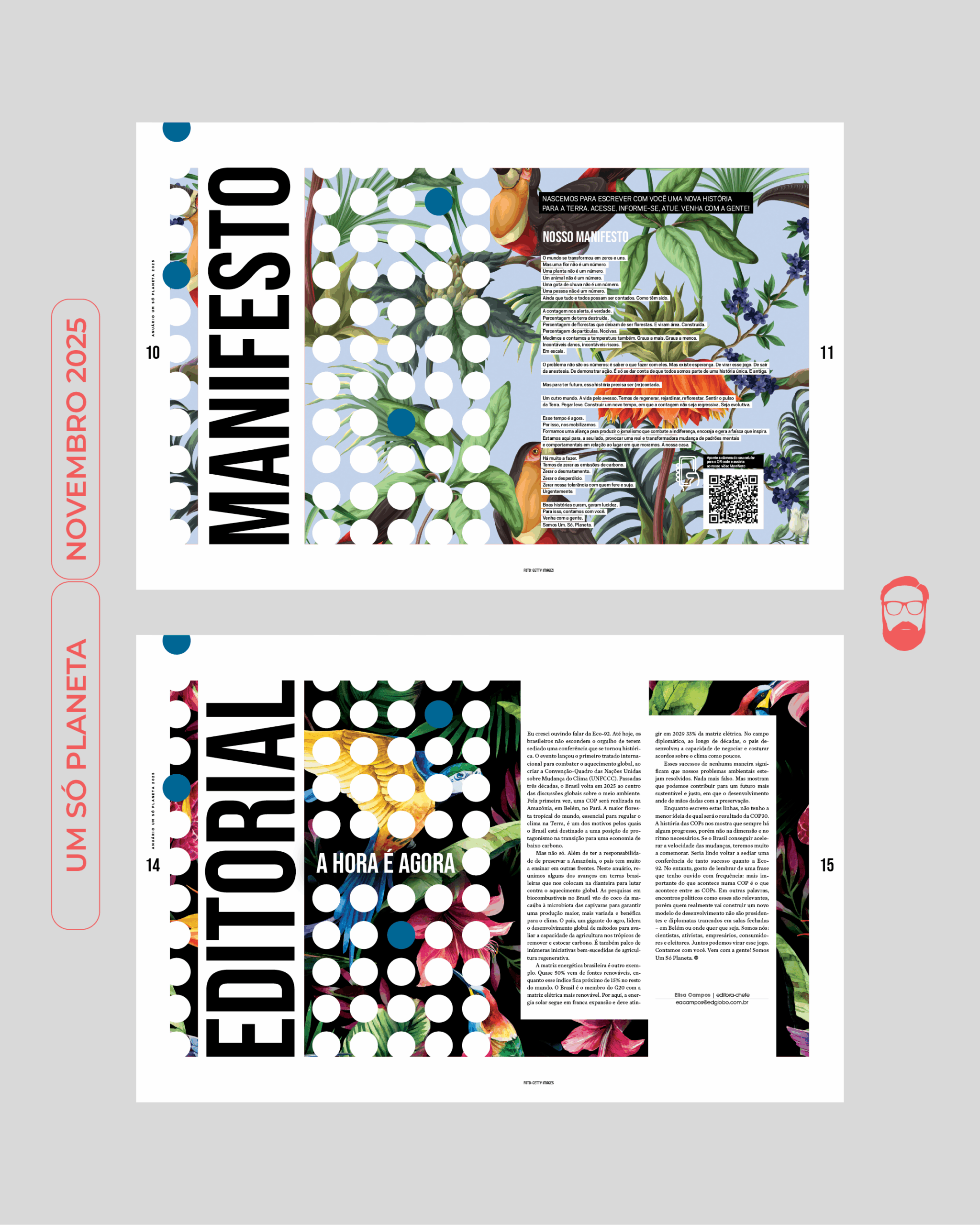 Maior projeto de sustentabilidade do Grupo Globo, o Um Só Planeta é uma plataforma que reúne matérias de todas as marcas do grupo, além de reportagens especiais feitas por uma equipe dedicada a marca. Nasceu como uma plataforma 100% digital, com foco no site e nas redes sociais, porém, já no primeiro ano de vida, ganhou um anuário. Para combinar com a marca, fiz um projeto gráfico bem arrojado, com muitas fotos e fragmentações, além de uma paleta de cores bem marcante. Abaixo, um exemplo das 4 primeiras edições.